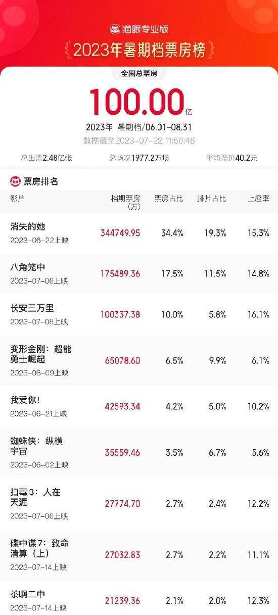 原标题:2023暑期档票房破100亿 《消失的她》暂列第一