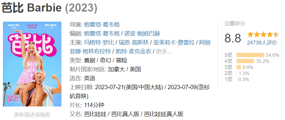 在豆瓣平台,《芭比》开分就直接飙上8.8分,五星好评占比最高,约为54%,其次是四星好评,约为35%。