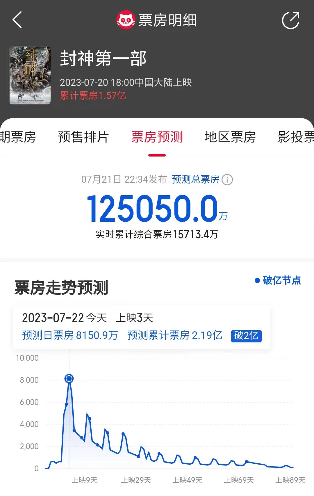 7月22日,猫眼专业版开出对《封神第一部》的票房预测,该片的内地总票房被预测为12.50亿元。早前一日,该片的内地票房预测是14.23亿元。《封神第一部》上映首日,猫眼专业版的最终票房预测,竟然高达15亿元以上。这意味着,经过3日上映,和已经形成的票房走势,猫眼专业版方面已经把该片的票房预测数字,从15亿元以上,下调到了12.5亿元。