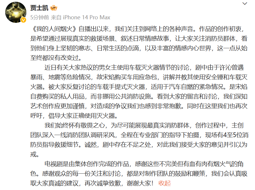 原标题:贾士凯回应《我的人间烟火》争议情节:倡导大家正确使用灭火器
