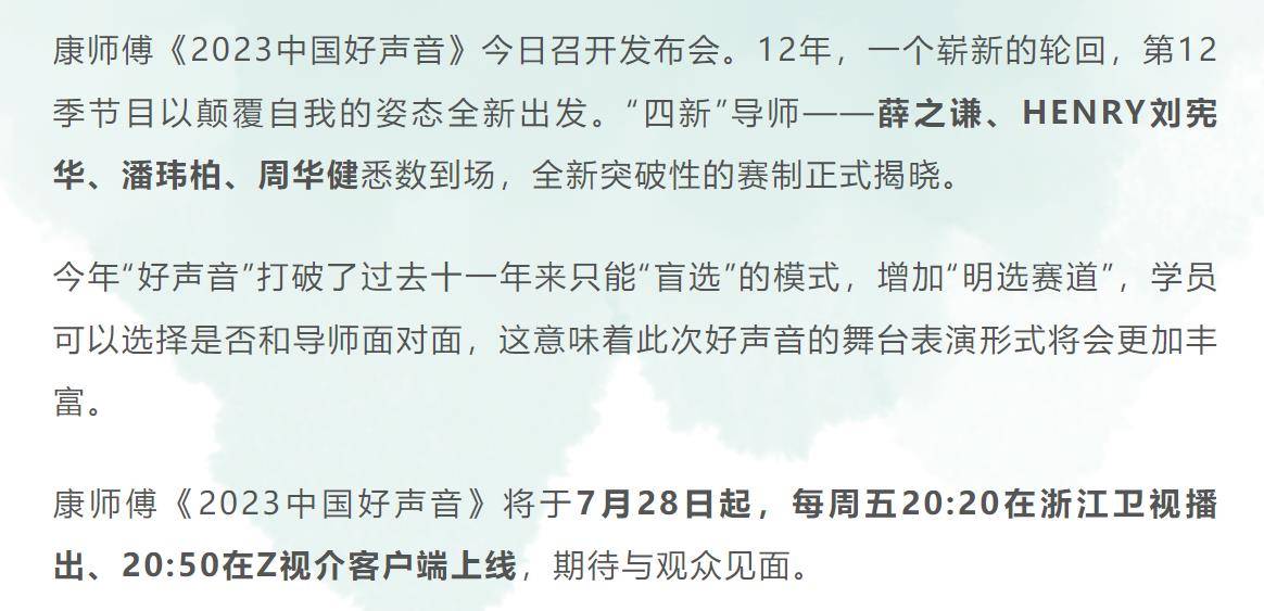 7月28日周五晚,2023《中国好声音》将正式开播。
