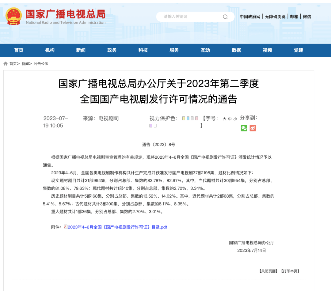 7月19 日,国家广播电视总局发布《关于2023年第二季度全国国产电视剧发行许可情况的通告》。
