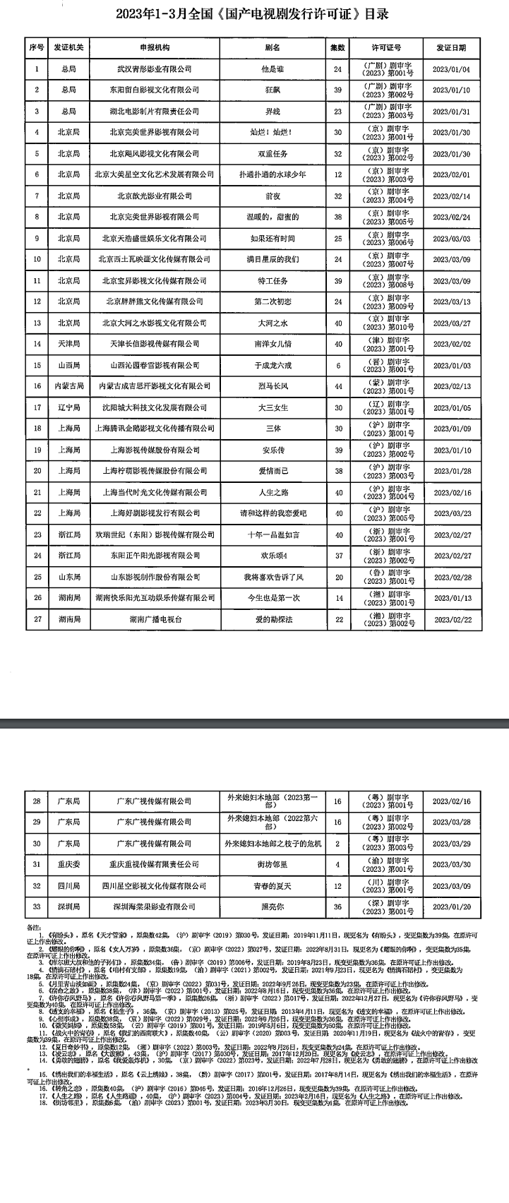 今年4月,国家广播电视总局发布《关于2023年第一季度全国国产电视剧发行许可情况的通告》。