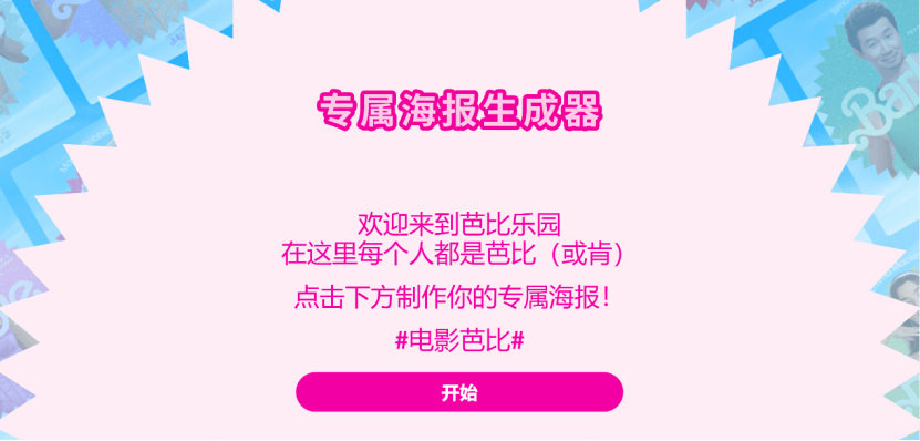电影《芭比》人物版海报发出后,一个可以制作芭比风格版的专属海报生成器的网站也同步上线。网站写着“欢迎来到芭比乐园,在这里每个人都是芭比(或肯)”。人物版海报用马卡龙般的配色为每一名角色都设计了专有的ID海报,每一个人都是独一无二的。网站也沿承了这样子的风格,每个点进去的网友都可以用自己的照片加入到芭比的大家庭中,制作一张独属自己的“芭比版”海报。