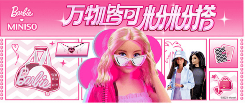 粉色派对也同时在多处落地,芭比的梦幻夏日首展在广州番禺天河城开展,名创优品在长沙黄兴南路店直接“粉”刷了整个门面。