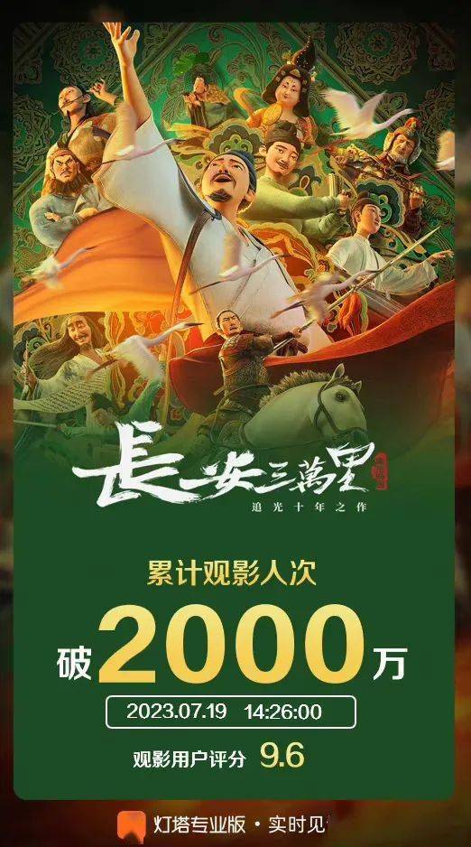 7月19日,据灯塔专业版,影片《长安三万里》上映12天,观影人次突破2000万,累计票房已超8亿,超越《白蛇2:青蛇劫起》成为追光票房第一,跻身国产动画影史票房前十。