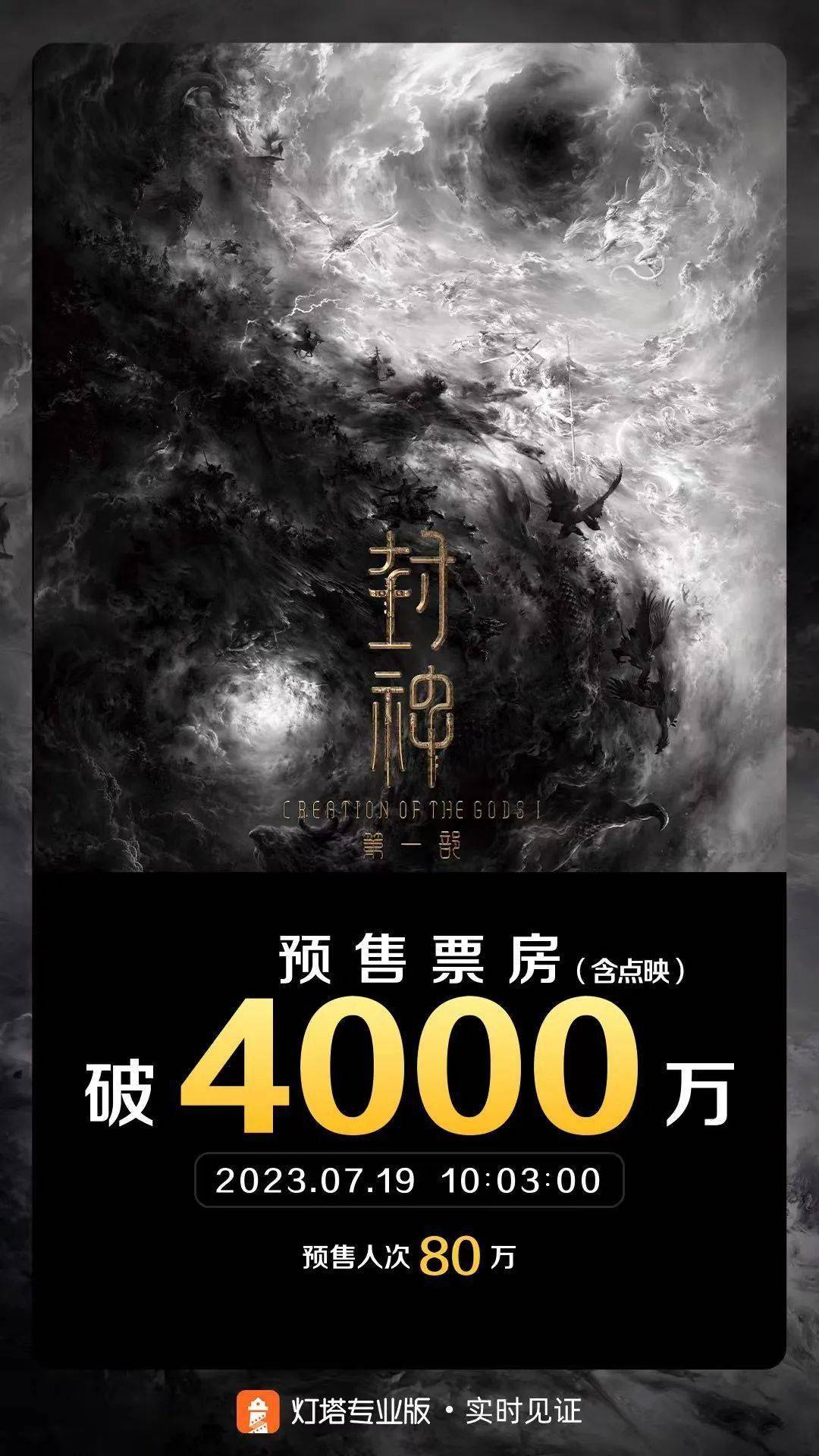 据灯塔专业版实时数据,截至7月19日10时3分,影片《封神第一部》点映及预售总票房突破4000万。