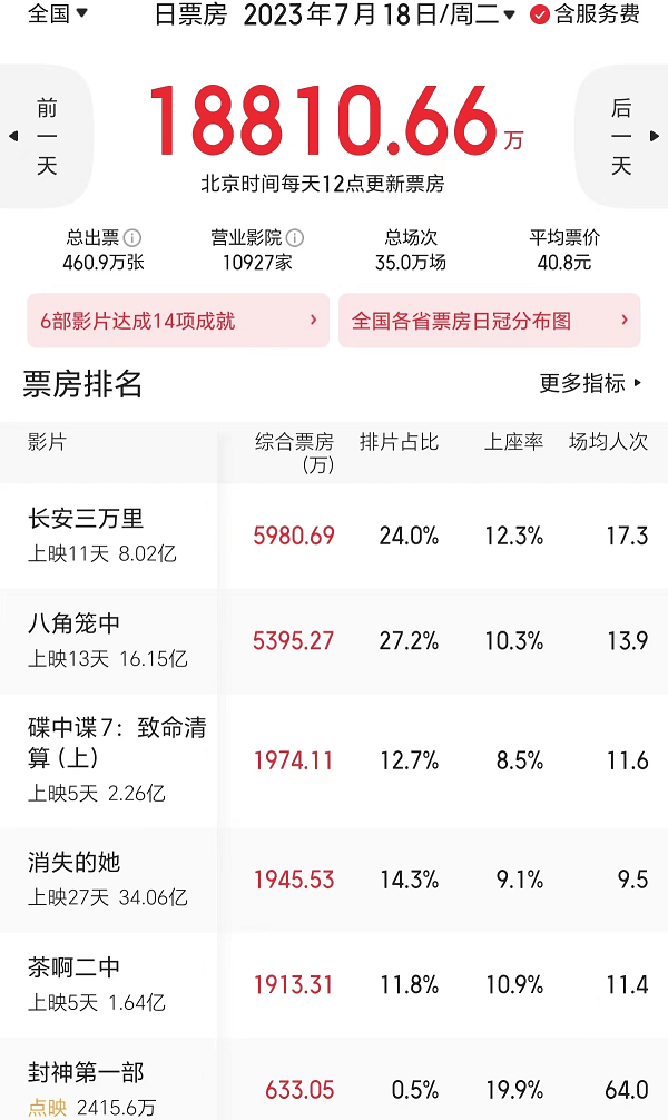 截止7月18日,《长安三万里》上映8天,累计总票房突破了8亿元,工作日单日票房近6000万元,排在第一,上座率也是第一。按此走势,猫眼专业版预测其最终总票房可能冲15亿元,仅次于《哪吒》《姜子牙》,排进国产动画票房前三。