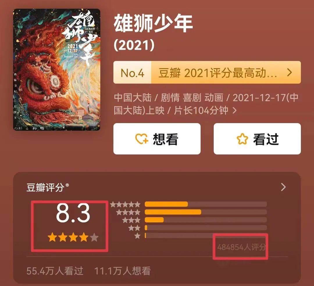 虽然受到了不断的争议,《雄狮少年》还是获得了大多数人的认可,48万人打出了8.3的高分。