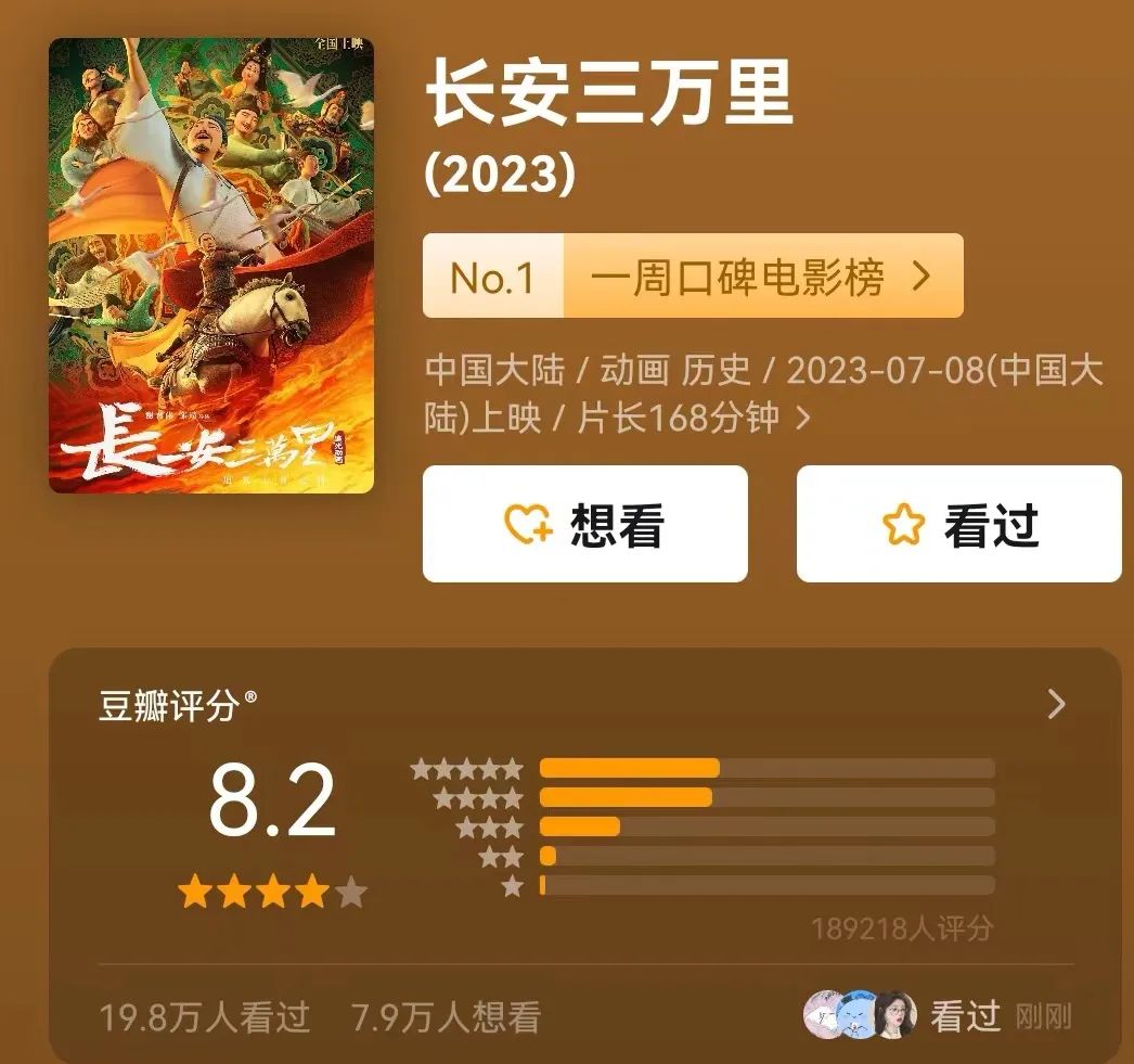 在“神仙打架”的暑期档,国产动漫电影《长安三万里》却成为了一匹黑马,经过口碑不断发酵后,近20万人打出了8.2的高分。