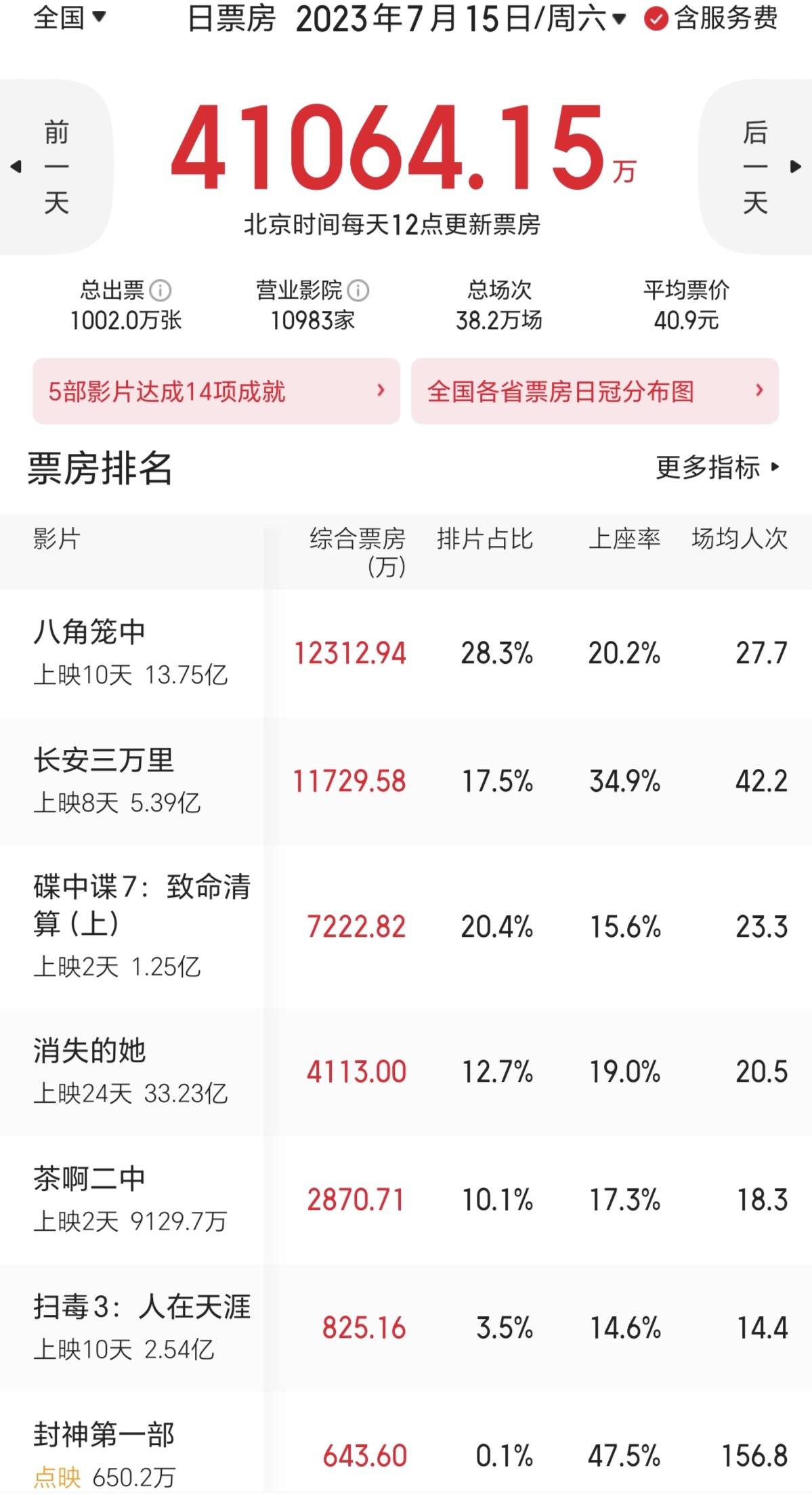 原标题:《长安三万里》日票房1.2亿创新高 上座率远超《八角笼中》《碟中谍7》