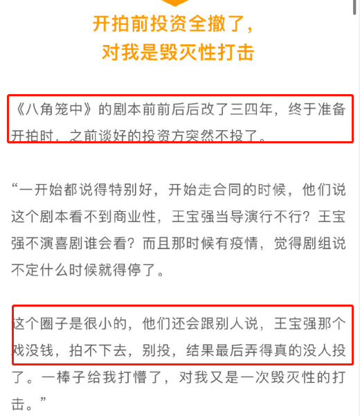 《八角笼中》就比较惨了,由于王宝强上一部导演作品的成绩太差,资方不看好,竟在电影开拍前全部撤资。
