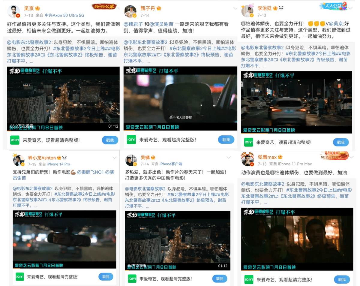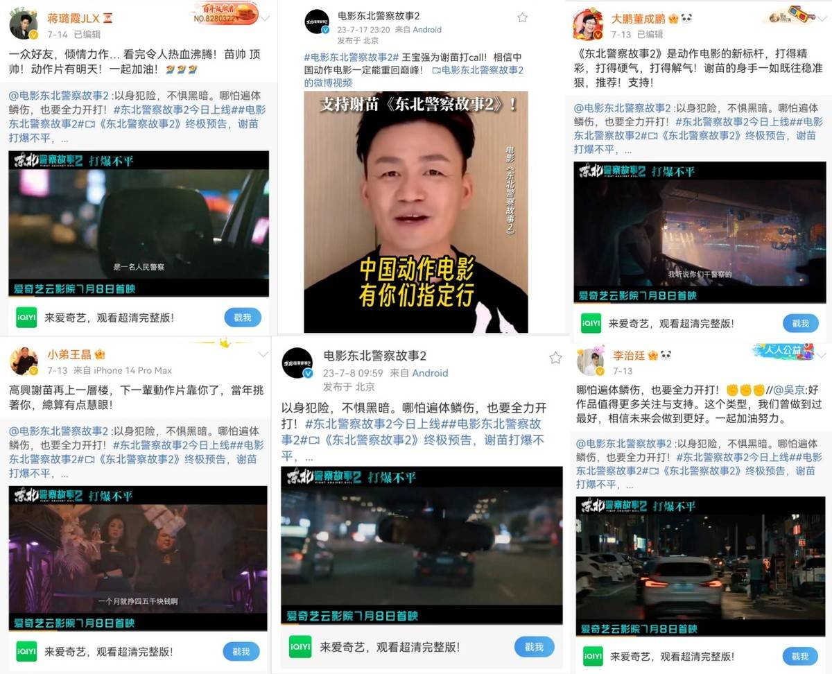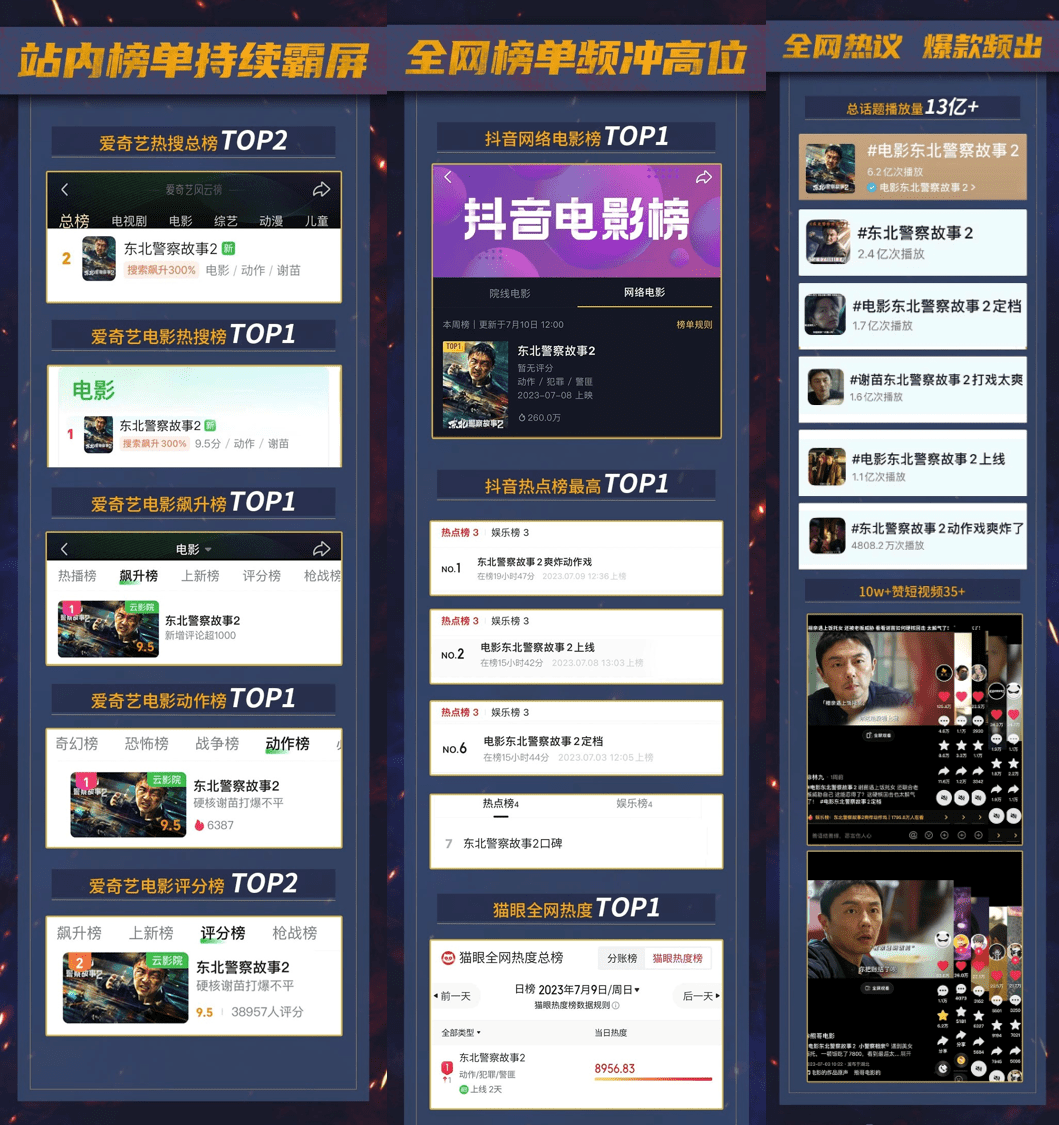 自7月8日首映以来,《东北警察故事2》热度节节攀升引发全网热议。爱奇艺站内方面,本片登上爱奇艺热搜总榜和爱奇艺电影评分榜TOP2,霸占爱奇艺电影热搜榜、爱奇艺电影飙升榜、爱奇艺电影动作榜榜首。站外方面,影片登上抖音网络电影榜TOP1、猫眼全网热度TOP1;抖音相关总话题播放量13亿 ;#该轮到谢苗火了##吴京为谢苗新电影打call#等多个微博高热话题下,不少观众表示被片中谢苗干净利落的打戏所折服,称赞“太帅了李红旗”“谢苗真的要成为新一代国产动作片的领军人物了!”“谢苗靠网络电影作品走出了自己的动作片路线,未来可期”……