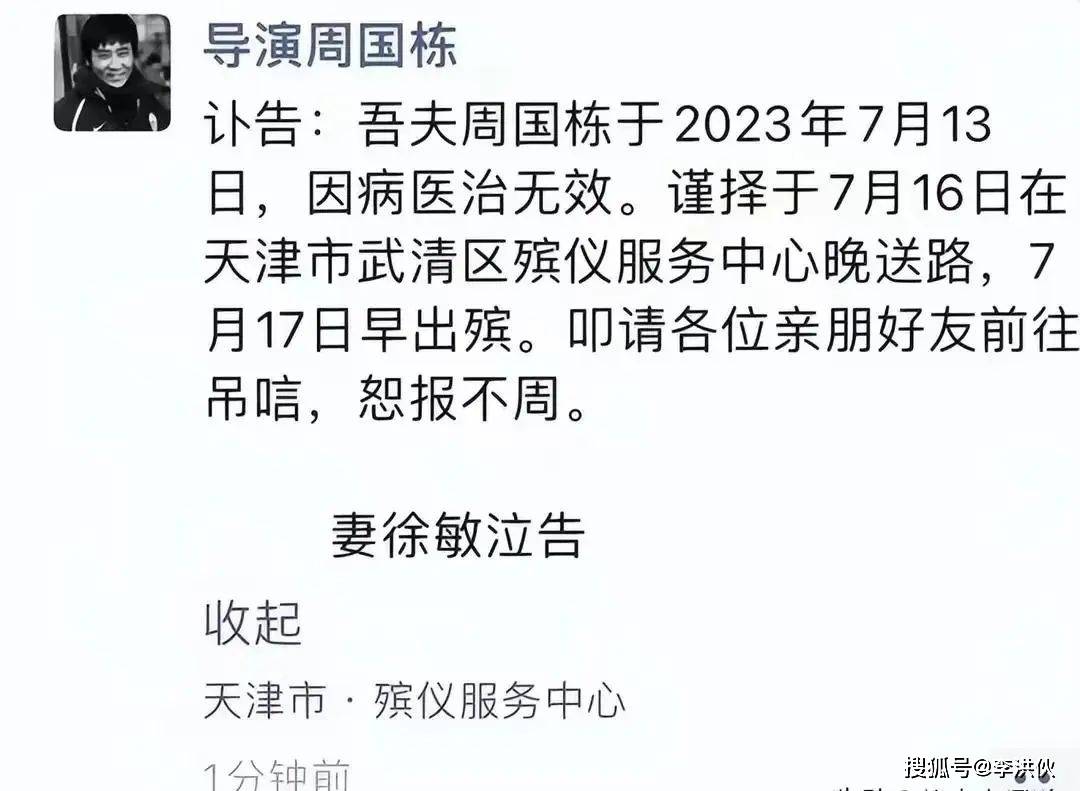 吾夫周国栋于2023年7月13日因病医治无效,谨择于7月16日在天津武清区殡仪服务中心晚送路。