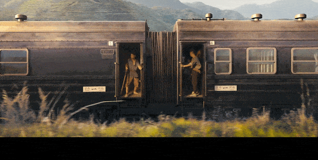 还有一幕,是伴随着紧凑的鼓点,廖凡饰演的老孙和打劫金条的人们在火车上对峙。
