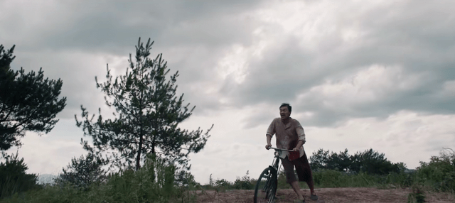 泼墨的夜雨下,张译骑着自行车载着男主,两人在黑暗中缓缓向前,仿佛进入未知的命运。