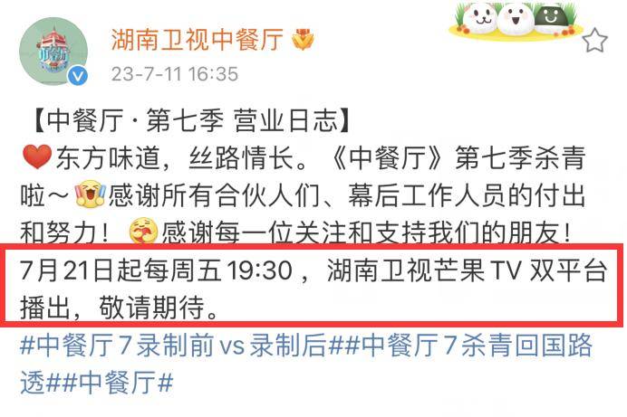 通过《中餐厅7》官微可以看到,它正式定档7月21日首播,并且于每周五晚7点半准时更新,不仅与《向往7》同天更新抢热度,还从原来的十点档提前到了黄金档。不得不说,芒果台将周五黄金档如此好的档期给《中餐厅7》,可见对这档节目是寄予厚望的。