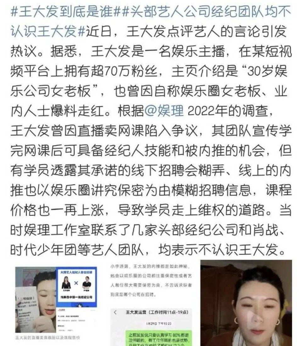 不过,也有人说这个王大发 纯纯江湖骗子一个,手里没有半点真料,头部艺人公司经纪团队都不认识这货。