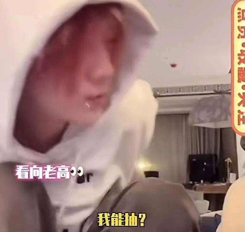 问经纪人老高自己能不能抽(这是可以说的吗),得知不能后瞬间老实,转头又drink起了“小麦果汁”。