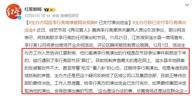 事后该商场管理人员明确回复,与李行亮的合作是在《再见爱人》播出前定下了,虽然已经支付了定金,但如果最后领导决定取消合作,亏定金也认了,毕竟商场还是和消费者站一起的。目前虽然该商场还未正式通知是否取消李行亮商演,但是官方已经将其视频下架,大概率是不会如约举行了。