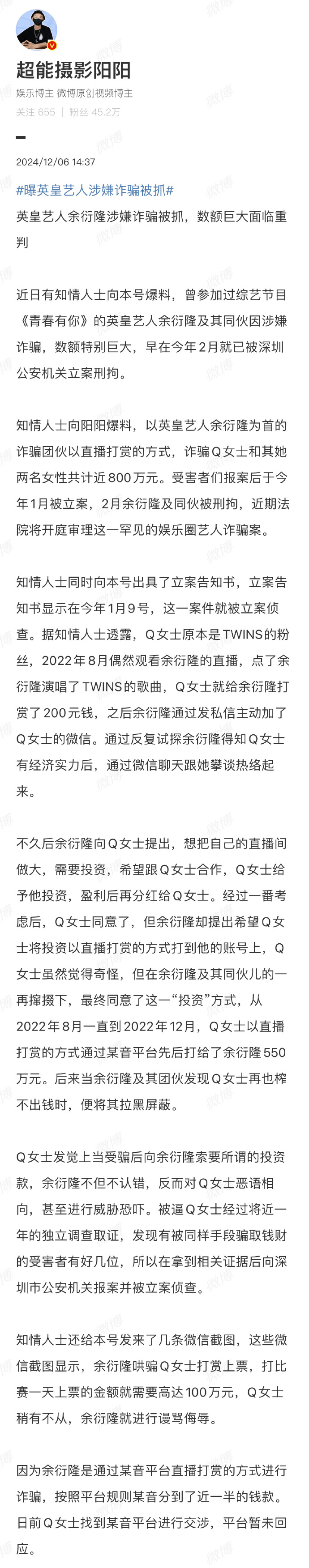 据爆料,余衍隆为首的诈骗团伙以直播打赏的方式,诈骗Q女士和其他两名女性共计近800万元,受害者们报案后于今年1月被立案,2月余衍隆及同伙被刑拘,近期法院将开庭审理此案。