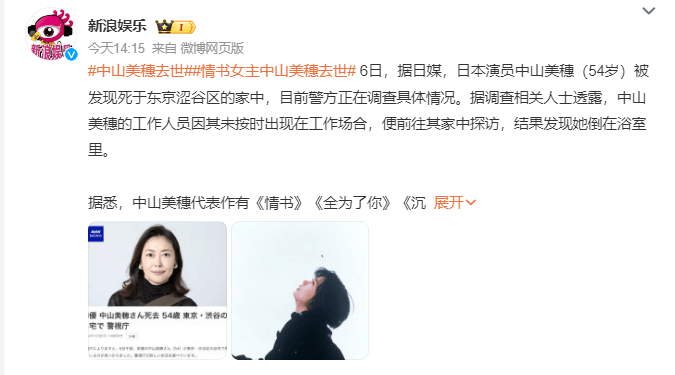 日本女演员中山美穗今天上午被发现在家中离世,享年54岁。