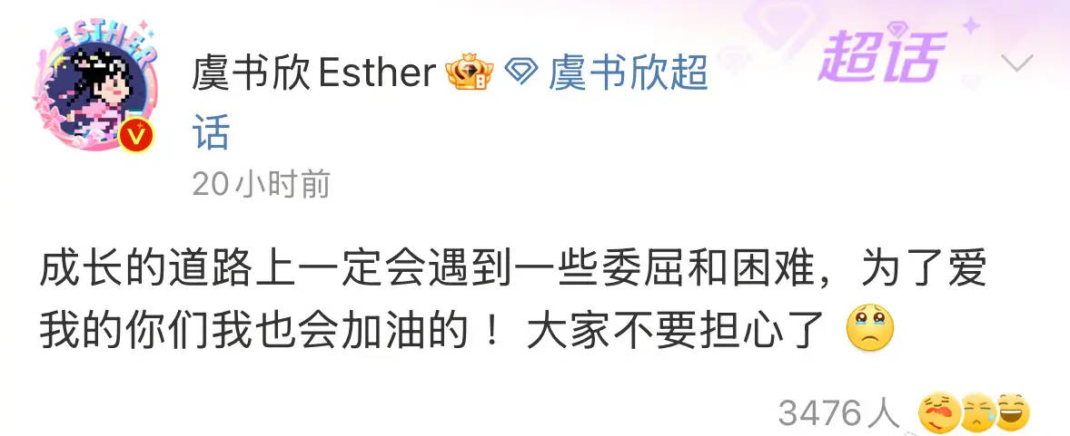 早前,虞书欣发文:“成长的道路上一定会遇到一些委屈和困难,为了爱我的你们我也会加油的 !大家不要担心了 ”网友猜测与剧组班底变动有关。