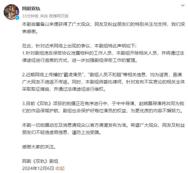 搜狐娱乐讯 6日,网剧《双轨》剧组发声明,称近期网络上传播的“霸凌演员”、“剧组人员不和睦”等相关信息,均为谣言,恳请广大网友不信谣不传谣。同时,剧组将委托律师,针对发布不实言论的相关主体采取取证措施,并通过法律途径进行维权。