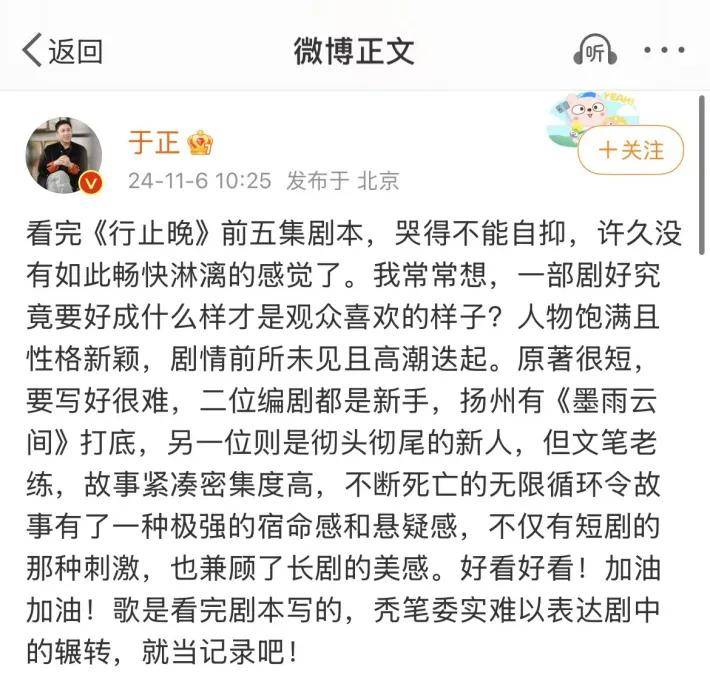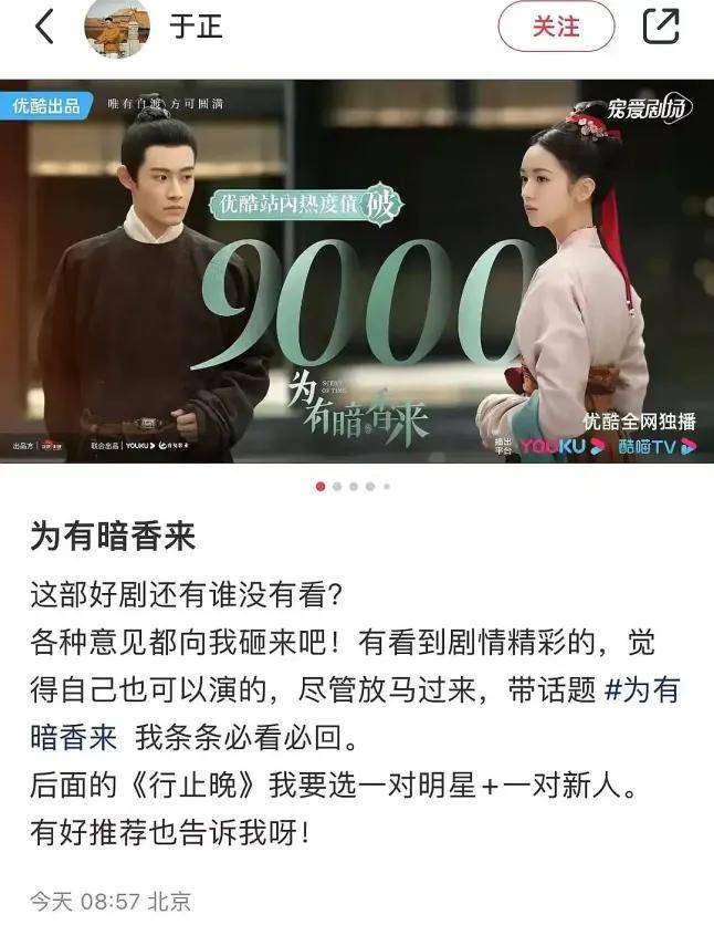由浙江娱丸影视文化有限公司申报的网络剧《行止晚》在10月终于正式备案。早在2023年于正在为《为有暗香来》宣传时,就已经在为《行止晚》预热。