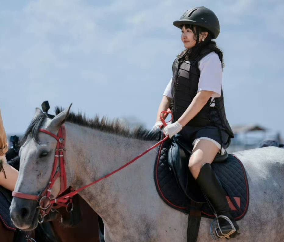 此前因为对动物恐惧而不愿意去动物园游览的她如今能毫无惧色地骑着马出镜,不缺爱意地凝望着为她牵马的李行亮。