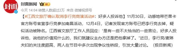 除开昔日录制的餐厅老板等纷纷发声还原真相,12月7日,江西文旅方面接受媒体采访时回应李行亮演出被除名一事,工作人员称因为近期有关其舆论争议较多,所以建议举办方将其拿掉了。