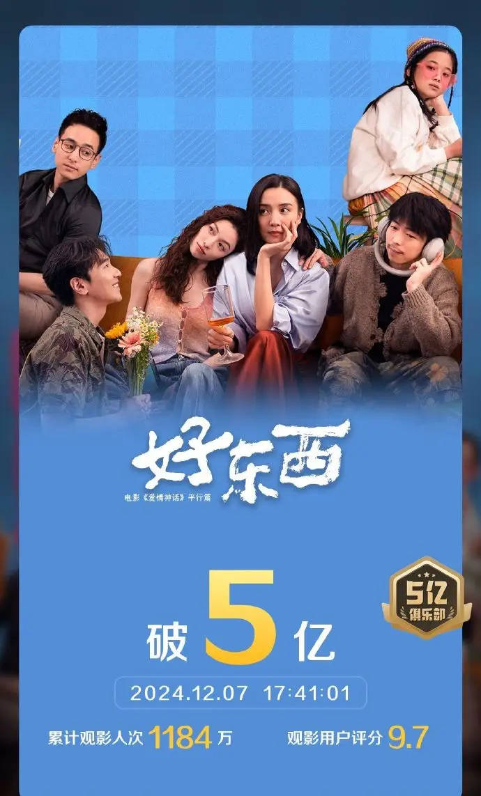 搜狐娱乐讯 12月7日,据灯塔专业版实时数据,截影片《好东西》上映16天票房突破5亿大关,成为2024年的内地市场,第四部达到此票房成绩的女性导演执导作品。