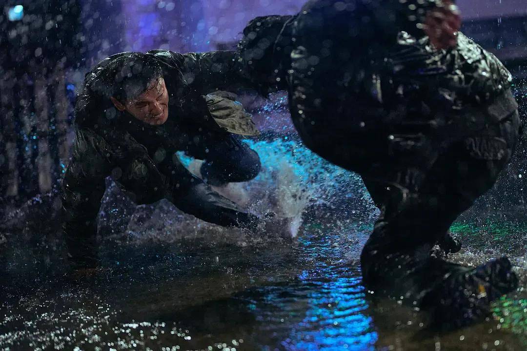 大雨中的贴身肉搏,雨水与挥拳动作交织在一起,打击的力量感与美感似乎都得到了增强。