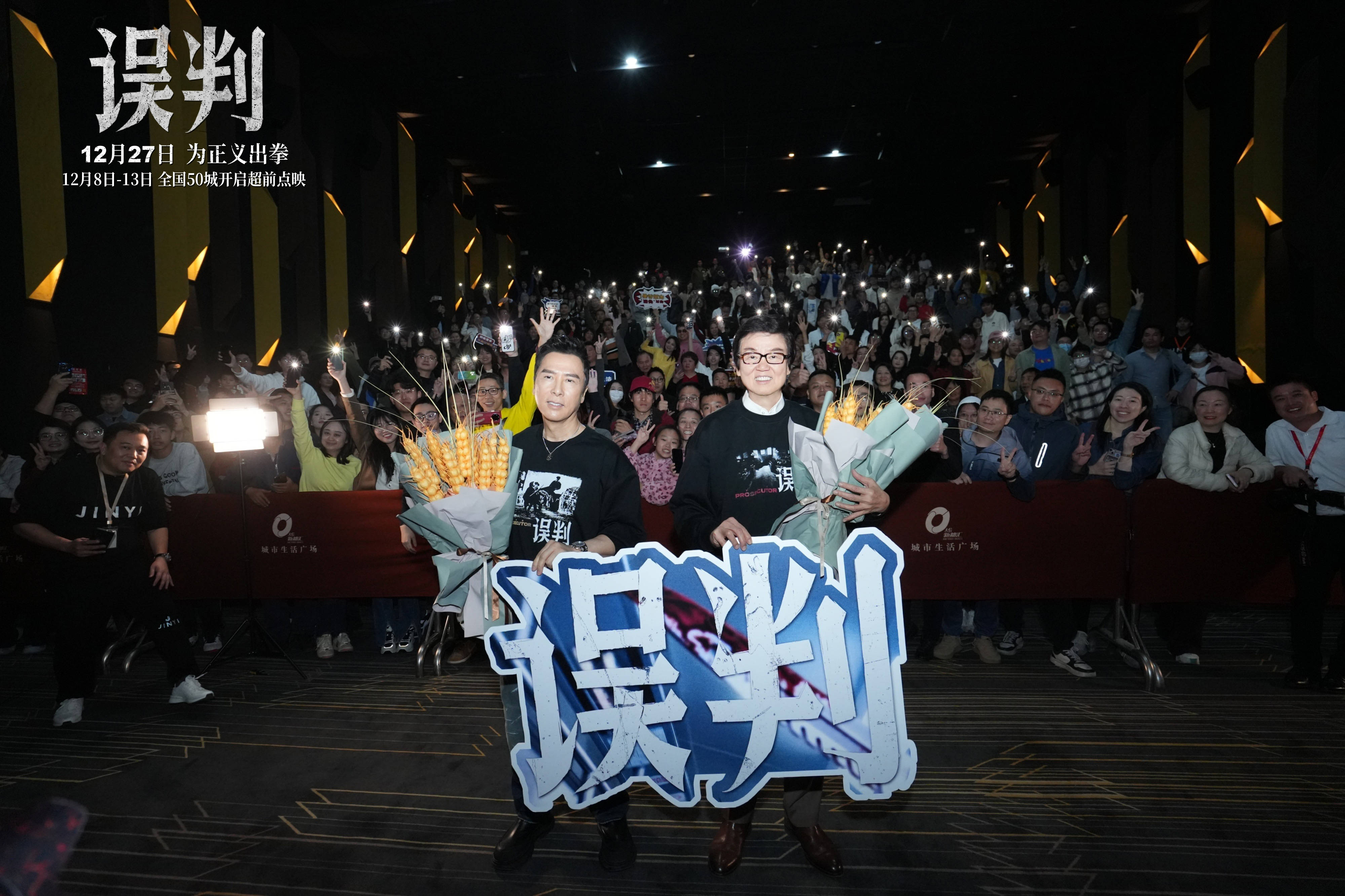 12月8日,贺岁档动作电影《误判》监制黄百鸣及在片中身兼监制、导演、演员于一身的甄子丹现身佛山路演,与观众们进行热情交流。“叶问”重返佛山老家,两位主创伴随着电影《叶问》配乐入场,满满回忆杀嗨爆现场。更有铁粉高举两位的经典作品《精武门》和《开心鬼上身》海报表示欢迎。影片已于12月8日-13日全国50城开启超前点映,12月27日正式上映。