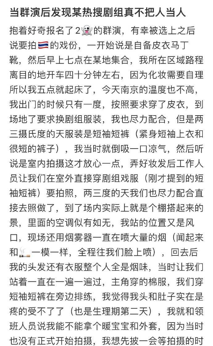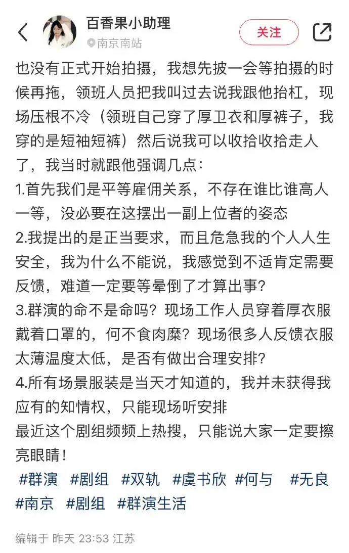 搜狐娱乐讯 近日,疑似有电视剧《双轨》的群演发文吐槽说《双轨》剧组不把群演当人,并晒出了相关聊天截图。据悉,网剧《双轨》由虞书欣主演,此前网上有爆料称网剧《双轨》更换导演、霸凌演员、剧组人员不和睦等,官方曾发布声明对相关信息辟谣,引发热议。