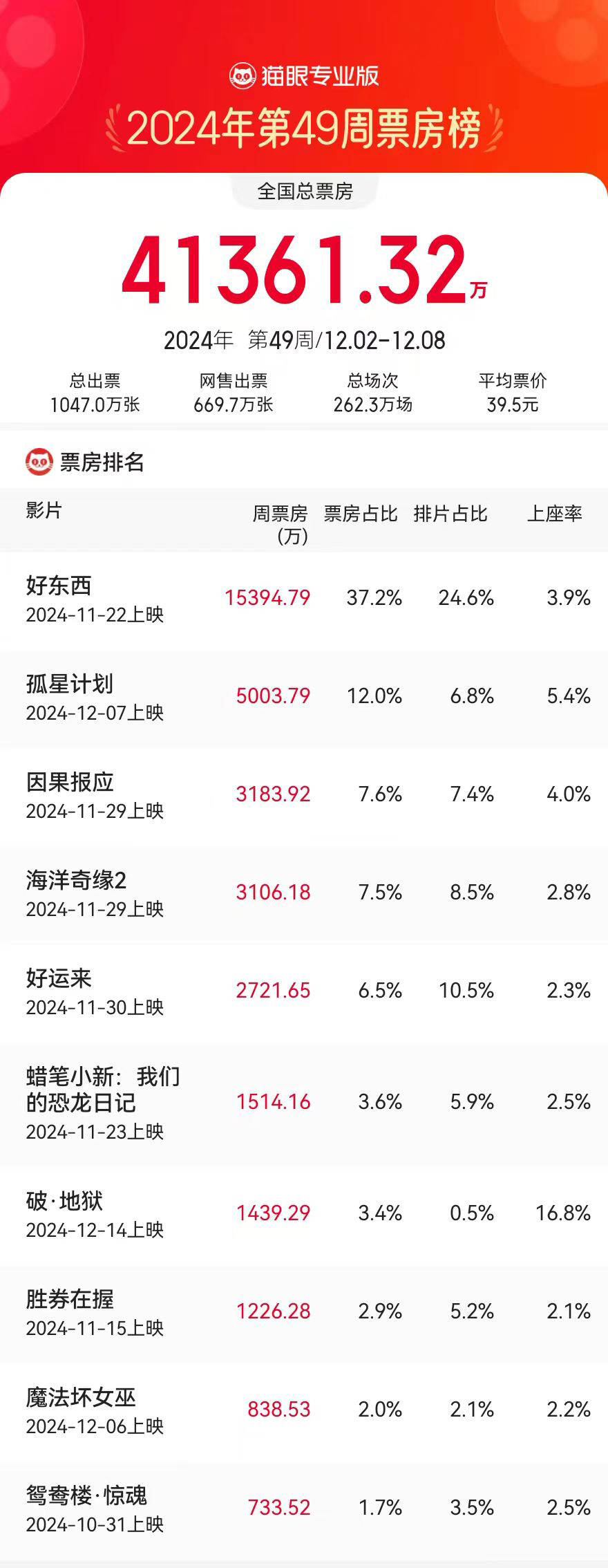 将于12月14日(本周六)正式上映的2024年度香港票房冠军电影《破·地狱》点映收1439.29万位列第七;