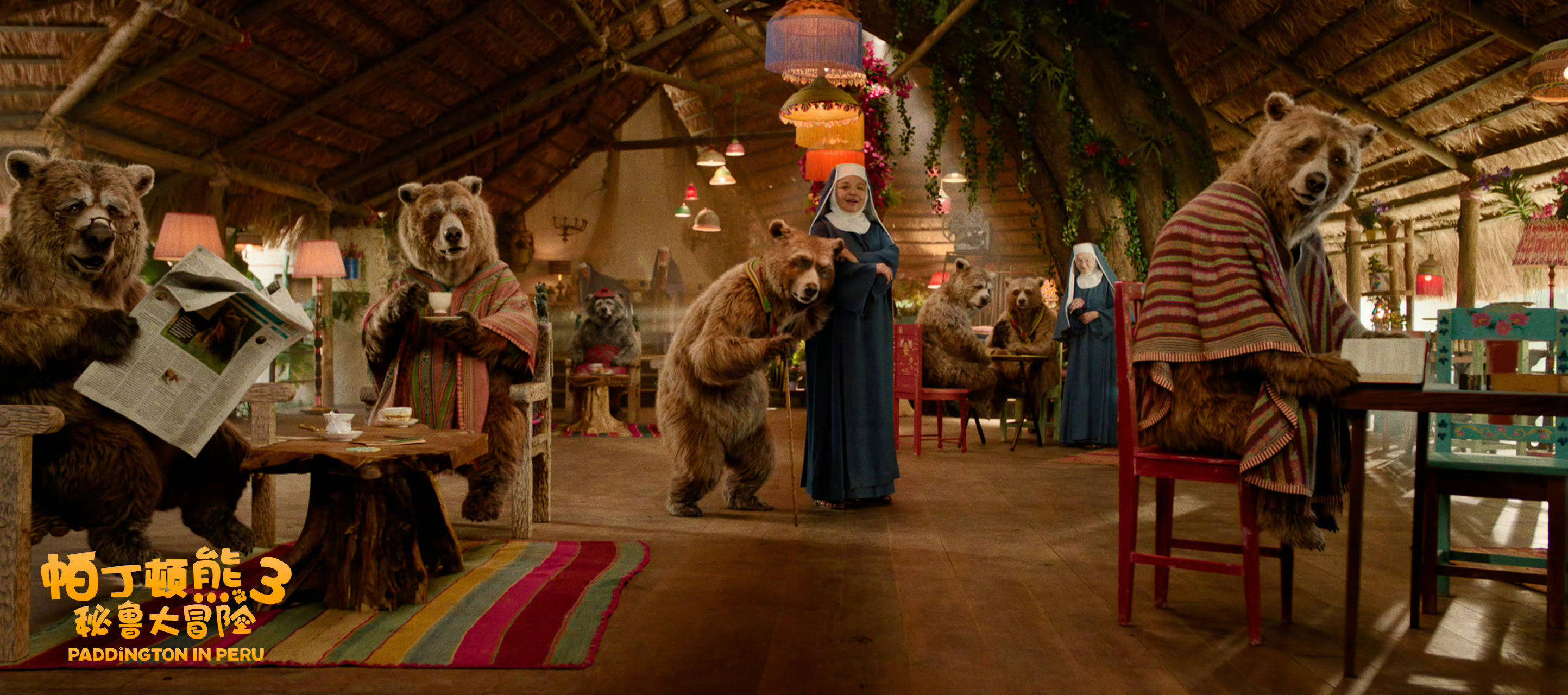影片此次在阵容上再度升级,奥斯卡影后奥利维娅·科尔曼与戛纳影帝安东尼奥·班德拉斯倾情加盟,分别饰演在退休熊养老院工作的院长嬷嬷和秘鲁的船长亨特,两人将在帕丁顿与布朗一家的探险之路上扮演关键角色。视觉层面上,影片依旧展现了优雅复古的英伦风情,除此之外,从深不可测的亚马逊森林,到云雾缭绕的秘鲁山巅,也让观众身临其境地欣赏到神秘唯美的秘鲁风光。为了更好地呈现画面,制作组远赴秘鲁和哥伦比亚进行取景拍摄,再结合精美的CGI和巧妙的场景布局,巧妙地融入了许多当地文化元素,让观众在享受视听盛宴的同时也能领略到异域风情。