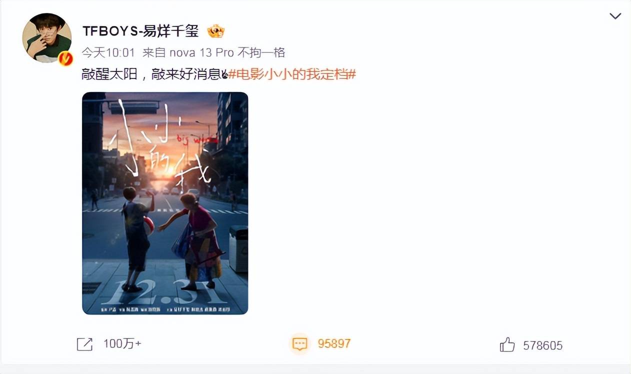 易烊千玺转发定档海报并写下“敲醒太阳,敲来好消息”,截至发稿有超过100万次转发和9万多条评论。