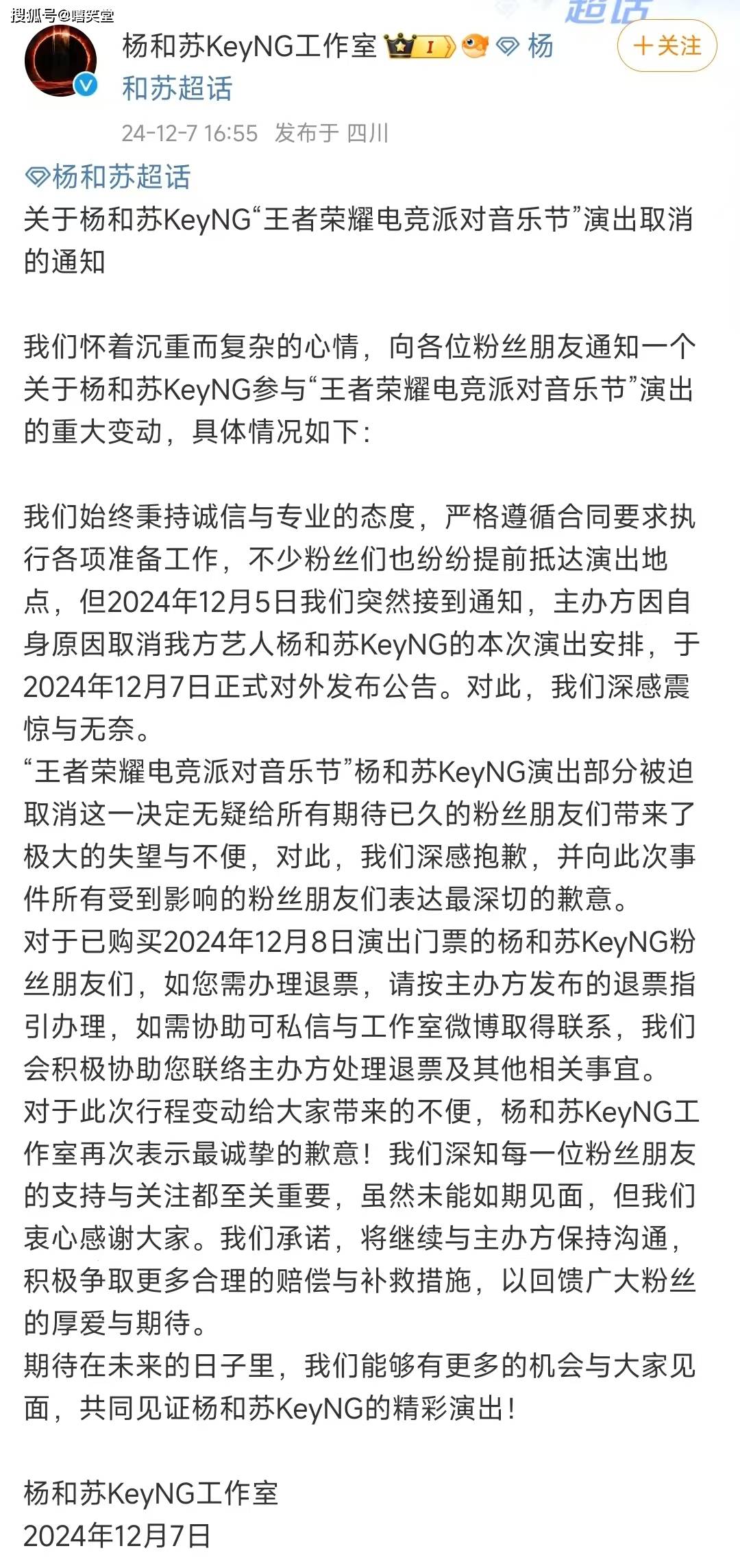 随后,王者荣耀音乐节宣布取消杨和苏的演出。