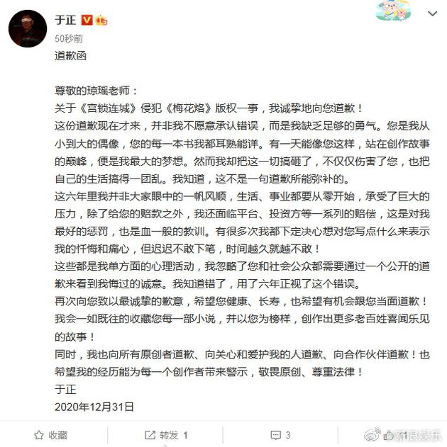 2015年,琼瑶起诉于正抄袭一案终审宣判,于正被判公开道歉并停止传播《宫锁连城》,五被告方共计赔偿原告500万元。这公开道歉,一直到2020年才在微博执行完毕。
