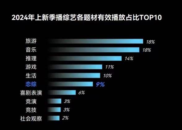 据云合数据,2024年,各平台上线恋综13部,较23年增加1部,较22年减少9部,但有效播放占比提升至9%,在今年上新季播综艺中,排名第六。