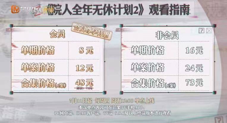 《密室大逃脱IP对撞记》《披荆斩棘4》《院人全年无休计划2》等综艺,均采取了不同的付费模式。其中《院人全年无休2》更是重量级,采取每集付费模式,会员尊享单期8元的特惠价格。观众要想第一时间看完全部6个案子,打包价48元。