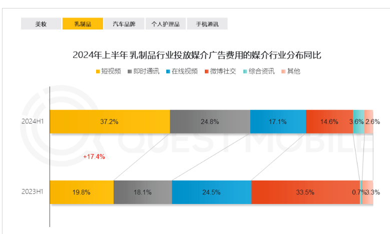 相应的,乳制品行业在短视频渠道则增加了预算——去年同期广告费用占比为19.8%,今年则增长至37.2%。
