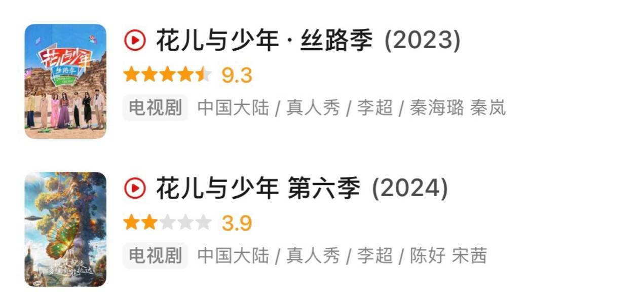 我们的综艺行业,也未形成一套成熟且高效的制作流程,换言之,流水线生产的质量不够稳定。就像《花儿与少年·丝路季》在豆瓣拿下9.3的高分,而同个导演制作的《花儿与少年6》豆瓣3.9分,仿佛前者的高口碑是误打误撞。