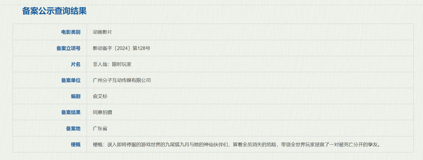 近日,国家电影局发布关于2024年11月下全国电影剧本(梗概)备案、立项公示的通知,动画电影《非人哉:限时玩家》正式立项。影片讲述了误入即将停服的游戏世界的九尾狐九月与她的神仙伙伴们,冒着全员消失的危险,带领全世界玩家拯救了一对被死亡分开的挚友。