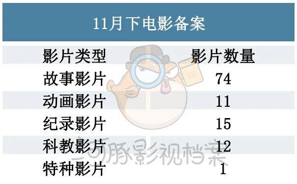在11月下备案的电影中,海润影业与联瑞影业分别推出小说改编电影《夜闻录 :夜枭》与电视剧改编电影《致我们单纯的小美好》;著名监制王红卫推出新作《头等舱》,战狼系列编剧刘毅联合博纳再推主旋律大片《四渡》;咏声动漫带来《猪猪侠大电影·竞速小英雄》《凤凰与我》分别面向儿童与成人动画电影受众,分子互动旗下经典IP非人哉也首度入局动漫电影。