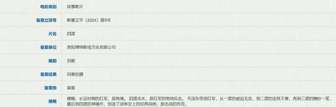 电影《四渡》由博纳影业备案,网传将由靳东担任主演。今年12月1日,贵州省委书记会见了中国煤矿文工团团长靳东及博纳影业董事长兼总经理于冬等人。中国煤矿文工团近年来围绕国家重大事件创作和演出了一系列作品,其中,由靳东担任总策划、艺术总监和主演的话剧《温暖的味道》于今年8月29日在中国煤矿文工团举行了首演发布会。此次合作,预计电影将充分利用贵州丰富的红色文化资源,特别是遵义会议精神进行创作,继1983年古月版《四渡赤水》后,我们也期待此次能够带来更多惊喜。