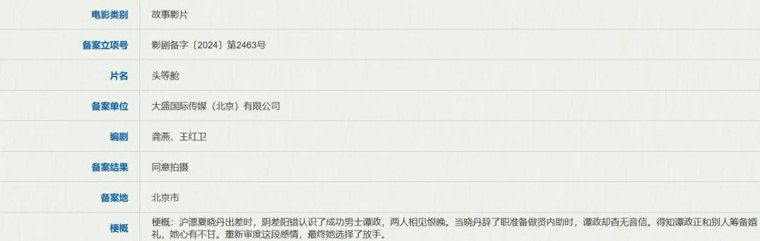 《头等舱》由大盛国际传媒(北京)有限公司备案,龚燕、王红卫联合编剧。大盛国际传媒出品了多部知名电影,包括《小时代》和《叶问2:宗师传奇》等,今年也推出了由王红卫监制的电影《从21世纪安全撤离》。