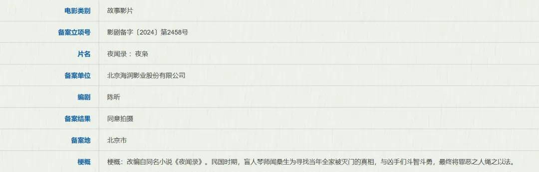 海润影业代表作品跨度较大,包括《大闹天竺》《何以笙箫默》《毒战》等,而编剧陈昕在该领域经验相当丰富,此前主要参与网络电影和电视剧的制片与编剧工作,如《纸人回魂》和《阴阳镇怪谈》,从作品名称中就能窥见编剧的创作风格了,这与原小说《夜闻录》的风格调性相契合。我们也期待此类电影能够焕发新的生机,迎来“第二春”。