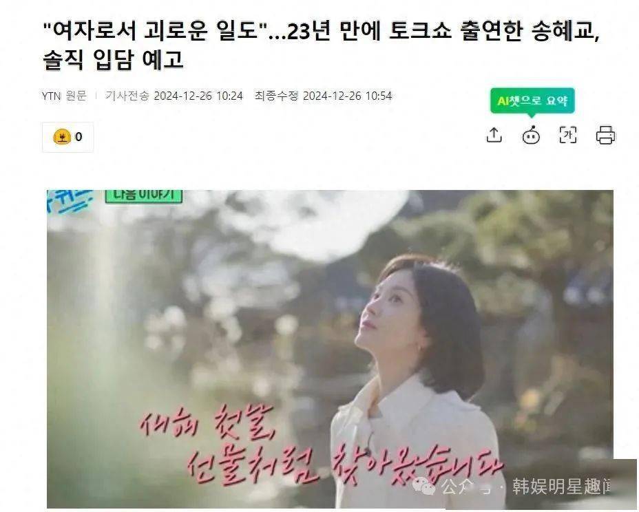 宝子们!宋慧乔出道23年来,第一次踏足脱口秀节目,据韩国媒体12月26日报道,演员宋慧乔将在出道23年后首次出现在脱口秀节目中,昨天《You Quiz》结束后的预告中,宋慧乔作为嘉宾出场。